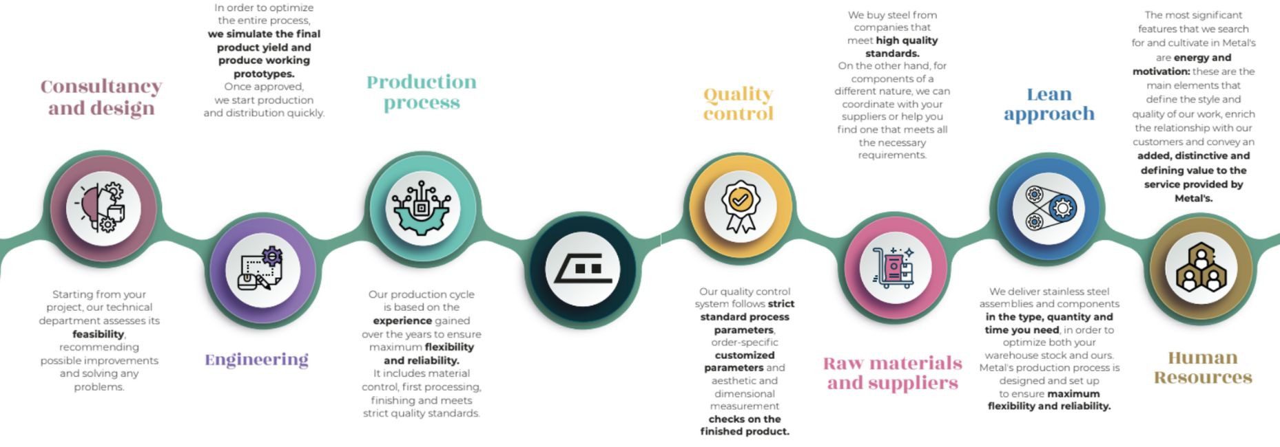 Production is the set of activities required to manufacture the product. This is the phase where raw materials are processed, semi-finished products are assembled, and manual or mechanical interventions are performed, all in accordance with agreed standards. At Metal’s, for example, we place strong emphasis on automation, such as machine part finishing or robotic welding.